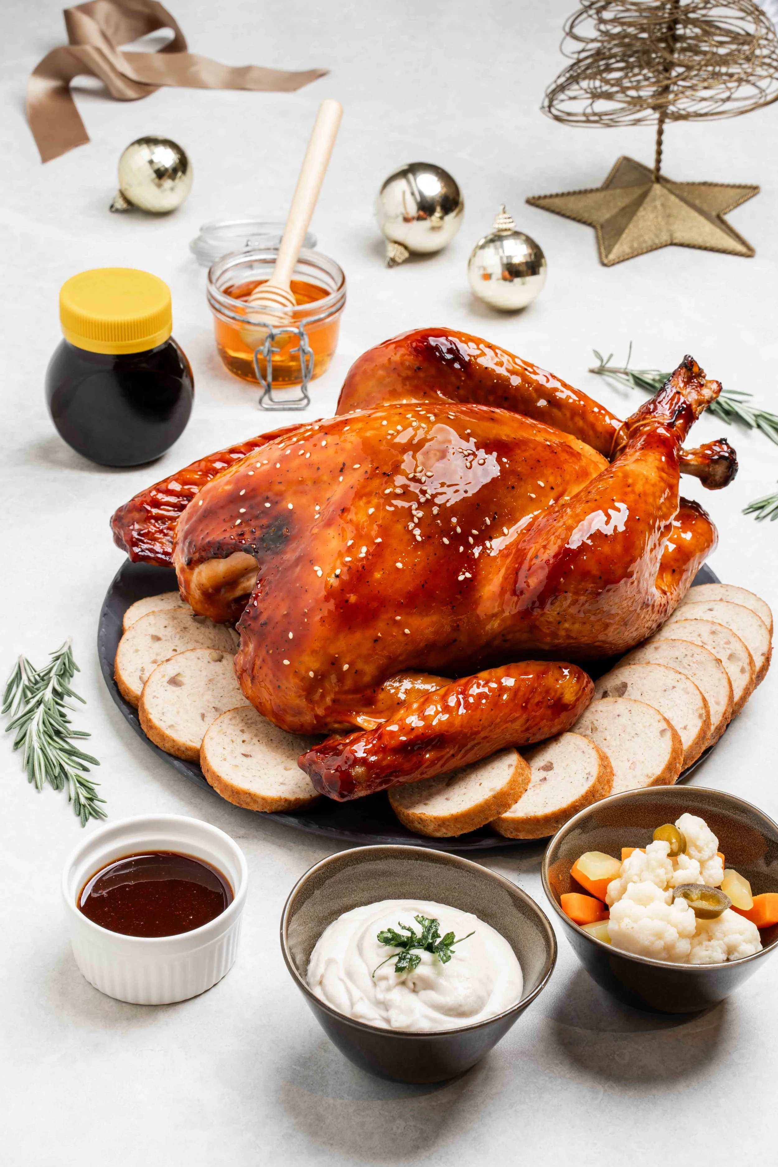 🍗 Honey Marmite Glazed Turkey – the savoury showstopper, styled with roasted vegetables and festive trimmings