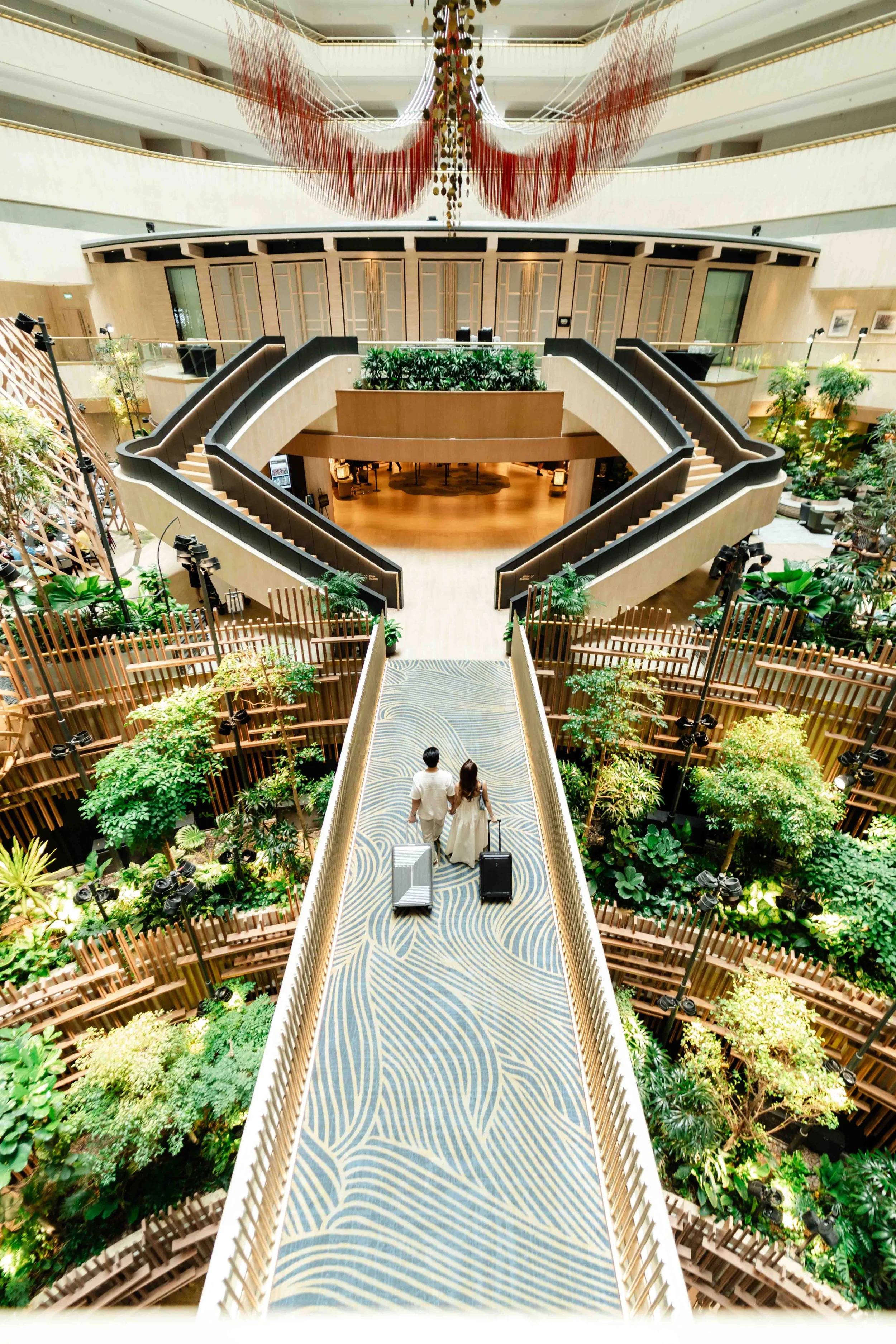 Highlight the hotel's identity as a garden-in-a-hotel, featuring lush indoor landscapes and wellness-focused facilities