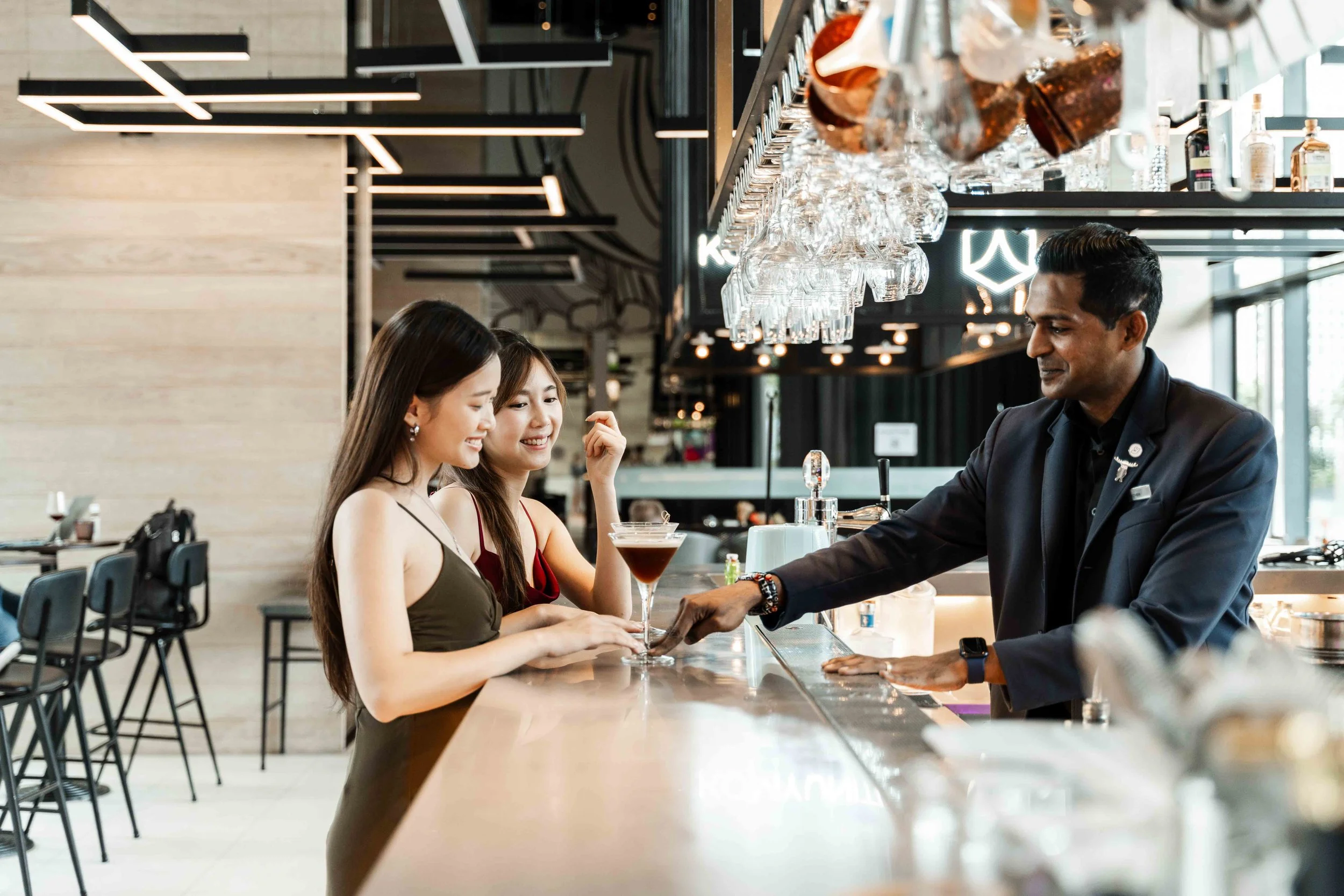 A leisure traveler enjoying cocktails at the bar, lounging in the room, and ordering food